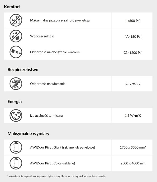 System drzwi obrotowych AWIDOOR Pivot to wyjątkowe podejście do drzwi wejściowych. Pozwala tworzyć bardzo duże konstrukcje, z wypełnieniem panelowym (AWIDOOR Pivot Giant) oraz przeszklone (AWIDOOR Pivot Colos), o imponujących wymiarach do 4 metrów wysokości.